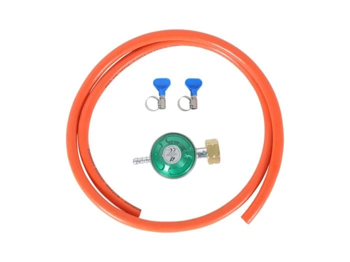 Le tuyau de gaz fourni a une longueur de 150 cm et est connecté au raccord cannelé du régulateur de pression. Faites glisser le tuyau sur le pilier et fixez-le fermement avec le collier de serrage fourni. De l’autre côté du tuyau, connectez-le de la même manière au pilier de votre poêle ou poêle, ce qui assure un raccordement sûr et sans fuite.