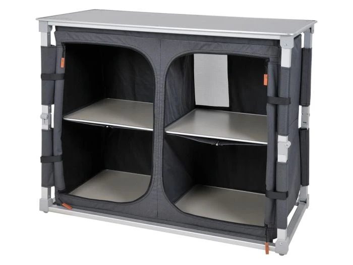 L’Obelink Alu Quick dispose de quatre compartiments de rangement spacieux où vous pouvez ranger votre matériel de camping. L’arrière est équipé d’un filet qui assure une bonne ventilation de l’armoire.