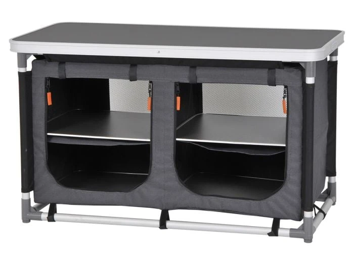 Cette armoire de camping a quatre compartiments de rangement spacieux dans lesquels vous pouvez ranger votre équipement de camping de manière organisée. L’arrière est équipé de mesh afin de bien ventiler l’armoire.