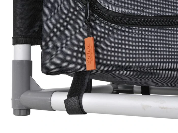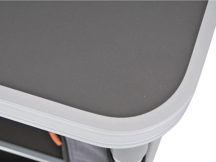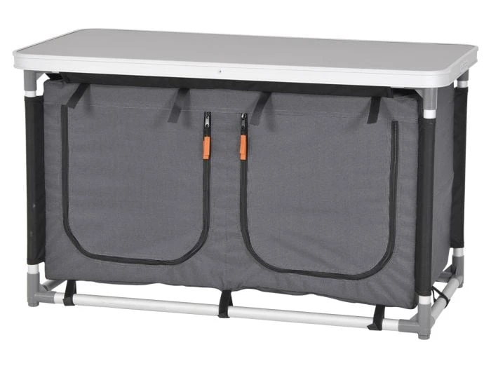 L’armoire est équipée de quatre pieds réglables afin de toujours pouvoir niveler l’armoire sur une surface inégale. Le plateau est fabriqué en MDF et pourvu d’un bord en aluminium. Une fois les vacances terminées, vous pouvez démonter le meuble facilement et le ranger dans le sac de rangement fourni.