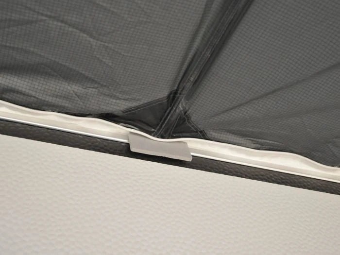 Le Baroness est livré en standard avec des sardines et des cordes pour monter fermement l’auvent. La jupe appropriée et le cache-roue universel garantissent qu’aucun courant d’air ne peut pénétrer dans l’auvent par le dessous de la caravane. Le tapis de sol en PE fourni s’adapte parfaitement à l’auvent grâce à sa forme trapèze. Repliez les bavettes de l’auvent sous le tapis de sol pour créer un joint étanche et empêcher autant que possible les courants d’air, le vent et la pluie de pénétrer dans l’auvent.