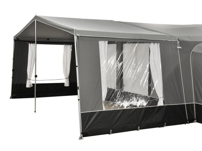 L’Obelink Capri sunroof est un auvent doté de parois latérales amovibles qui peut être fixé à l’auvent principal via un jonc et les bandes de raccordement incluses. Pour assurer une connexion parfaite entre les parois latérales de l’auvent et l’auvent principal, le toit dépasse de 30 cm sur l’auvent. Les coins sont équipés de boucles pour fixer l’auvent avec un ensemble de sangles anti-tempête en option. Grâce à sa toile polyester flexible, cet auvent est léger et facile à tendre, ce qui rend l’Obelink Capri sunroof idéal pour les vacances de camping de 2 à 3 semaines.