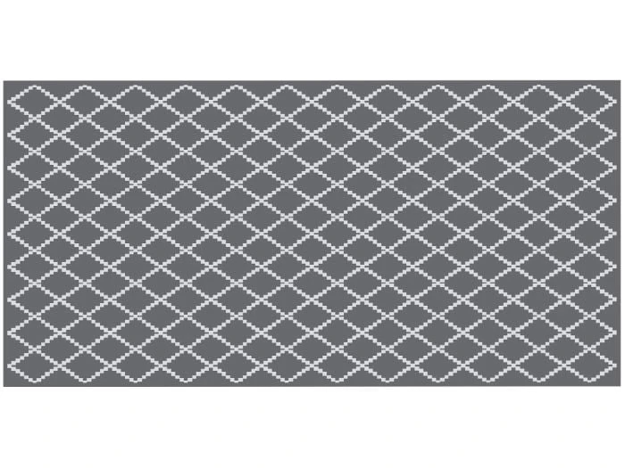 Ce tapis robuste au design moderne est résistant à la saleté, à la moisissure, aux UV et est facile à nettoyer. Le tapis est fabriqué en polypropylène tissé avec un bord en polyester tout autour. La structure dense du tissage empêche les insectes d’entrer par le dessous.