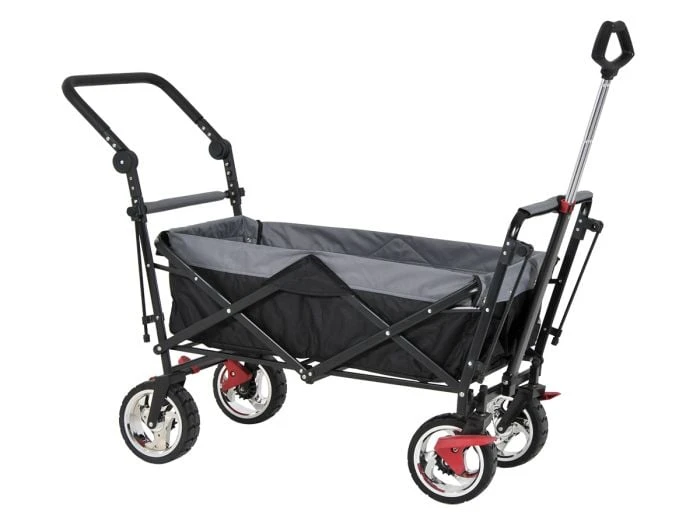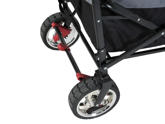 Ce chariot de transport est équipé d’une barre de traction à l’avant et d’une poignée à l’arrière. La barre de traction et la poignée sont toutes deux réglables en hauteur. Le guidon peut être rabattu et la barre de traction peut être fixée avec un clip de sécurité lorsqu’elle n’est pas utilisée. Le chariot est équipé d’un double système de freinage à l’avant et à l’arrière.
