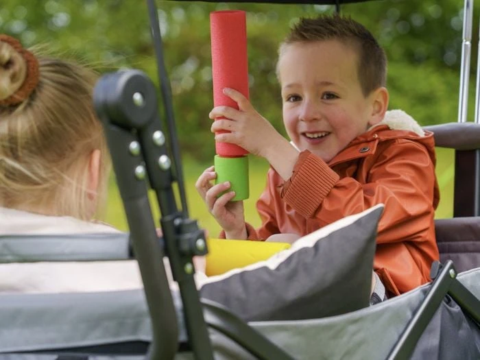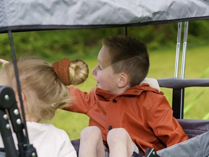 Parfois, une promenade est trop loin pour les jeunes enfants. Afin de passer une belle journée, vous pouvez utiliser ce chariot de transport Duo Solar. même si il pleut ou si le soleil tape fort, vous pouvez sortir. Grâce au toit solaire de ce chariot, les enfants sont assis au sec et à l’abri du soleil.