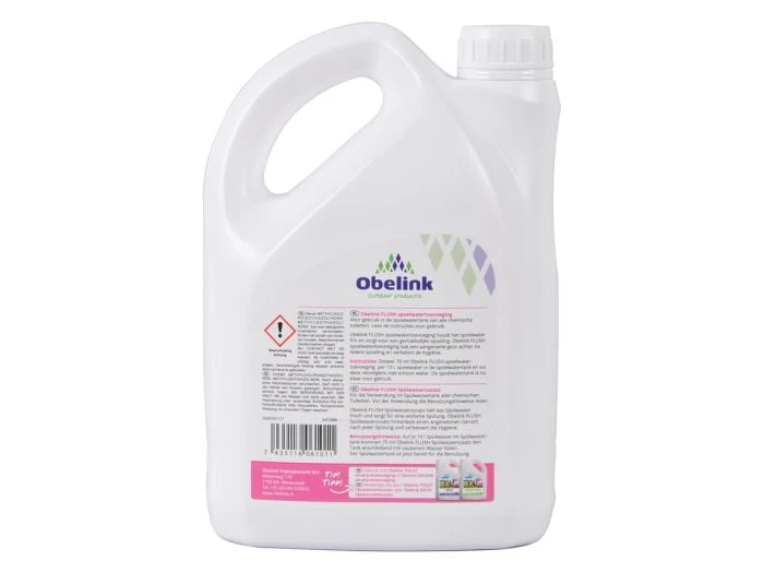 Pour rendre l’utilisation de vos toilettes chimiques encore plus agréable, vous pouvez utiliser l’additif d’eau de rinçage Obelink Flush. L’additif d’eau de rinçage Obelink Flush laisse une odeur agréable après chaque utilisation de la chasse d’eau et améliore l’hygiène. Il permet également de conserver la fraîcheur de l’eau de rinçage et assure un rinçage facile.