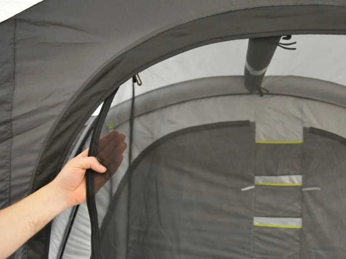 L’auvent spacieux à l’avant dispose d’une paroi avant détachable. Si vous n’utilisez pas la paroi avant, vous pouvez la ranger dans le compartiment de rangement intégré. La paroi avant est divisée en deux parties. La moitié gauche est équipée d’une grande fenêtre et la moitié droite d’une grande moustiquaire. La moitié avec la moustiquaire peut être roulée jusqu’à mi-hauteur. Cela crée une entrée spacieuse. Toutes les fenêtres peuvent être couvertes de l’intérieur avec un volet assombrissant. Ces volets peuvent être facilement zippés vers le haut. Vous pouvez donc jouer avec la privacy et la lumière entrante. Un tapis de sol PE séparé est fourni pour l’auvent afin que vous puissiez placer vos affaires sous l’auvent sans les poser directement sur l’herbe. Si vous préférez être assis directement sur l’herbe, vous pouvez choisir de ne pas utiliser le tapis de sol.
