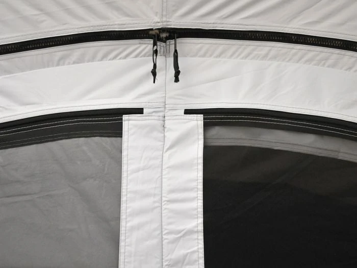 La ventilation a également été pensée. Par exemple, il y a des ouvertures de ventilation couvertes au-dessus des deux fenêtres latérales avant qui peuvent rester ouvertes même en cas de pluie. La deuxième fenêtre latérale à droite est équipée d’une grande moustiquaire et le côté droit est équipé d’une entrée latérale avec porte moustiquaire. À l’arrière se trouvent également deux ouvertures de ventilation qui sont ouvertes en permanence pour une circulation optimale de l’air dans les cabines de couchage. S’il fait trop froid vous pouvez fermer ces ouvertures de l’intérieur.