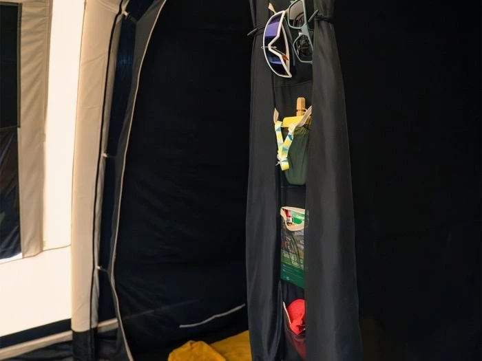 Lorsque vous allez faire du camping avec votre famille, vous avez besoin de beaucoup d’espace. Les enfants ont beaucoup d’affaires et bien sûr, vous n’avez pas envie de vous retrouver dans une tente trop petite avec toute la famille et toutes les affaires. Heureusement, la Miami 6 est suffisamment grande. Le grand espace de vie peut être utilisé de manière optimale grâce aux parois droites. Ainsi, il y a assez de place pour une table à manger avec des chaises, des armoires de camping et une glacière. Les grandes cabines de couchage peuvent accueillir jusqu’à 6 personnes. Au total, vous disposez d’une grande cabine de couchage qui peut être divisée par une paroi de séparation en trois cabines de couchage de la même taille, ou en une grande et une petite cabine de couchage.