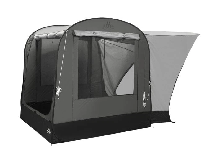 À l’arrière, l’Ontario est doté d’un rabat de connexion d’une profondeur de pas moins de 150 cm. Il peut être tendu facilement sur le toit de la voiture ou du minivan à l’aide de cordes. Les deux parois latérales sont pourvues de grands panneaux en filet qui peuvent être recouverts de l’extérieur par un rabat. Grâce au tapis de sol cuvette fixe, l’eau de pluie et la vermine restent à l’extérieur de la tente.