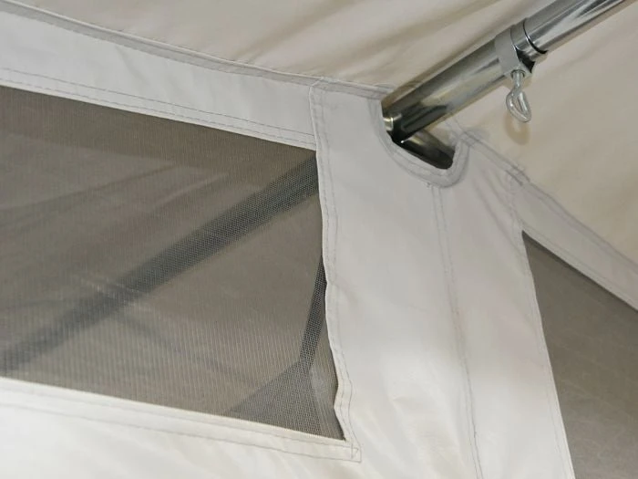 Une bonne ventilation est très importante pour une tente en PVC, c’est pourquoi l’Outhouse est équipé de nombreuses options de ventilation. Par exemple, il y a des ouvertures de ventilation permanentes sous le bord du toit et une grande fenêtre de ventilation avec volet dans la paroi arrière et les deux parois latérales.