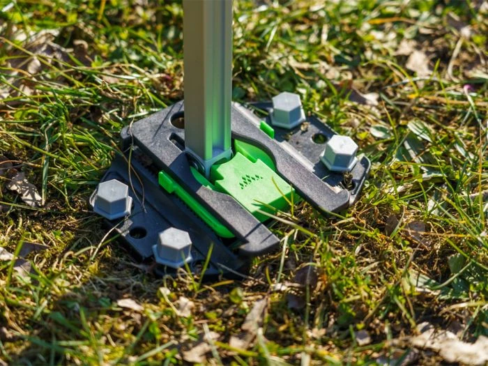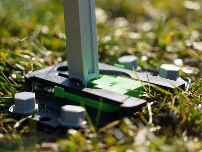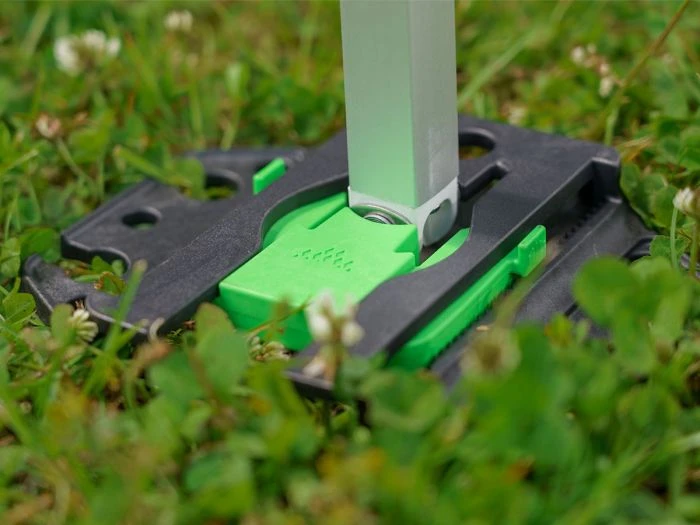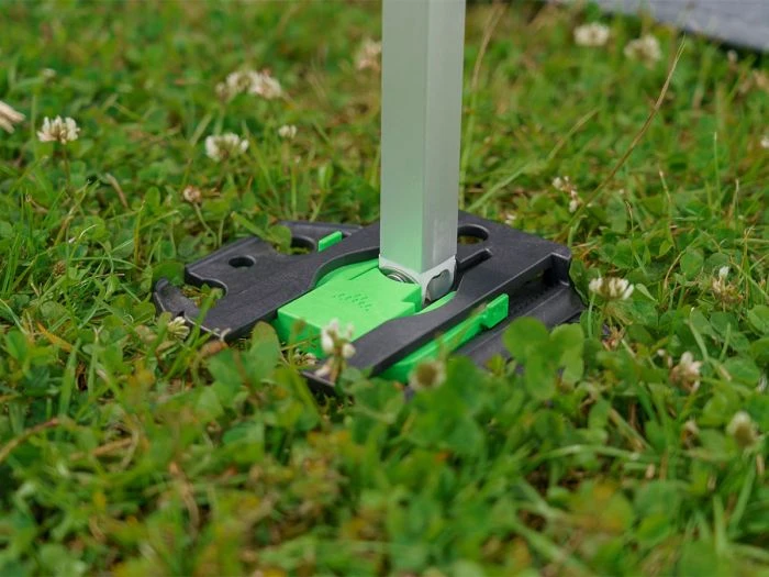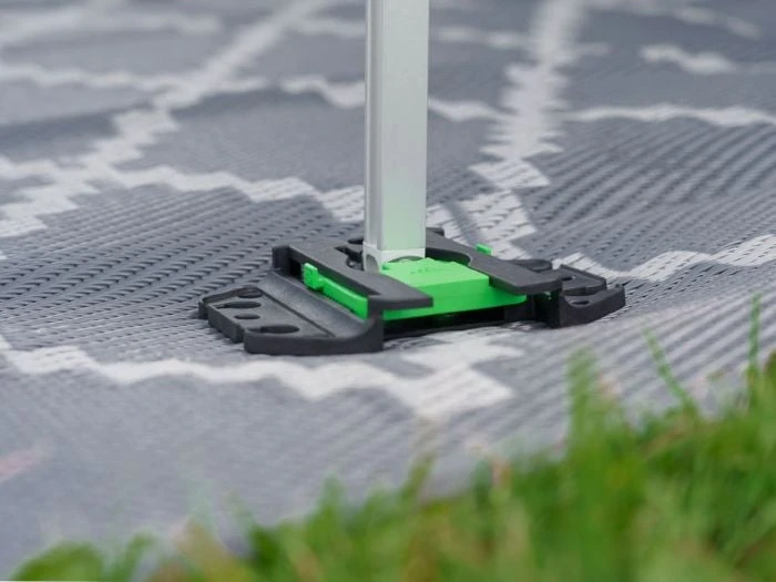 Vous pouvez Ă©galement fixer jusqu’Ă quatre piquets dans la plaque d’ancrage. Comme vous pouvez fixer quatre piquets Ă la plaque d’ancrage, celle-ci reste fermement au sol et le risque d’endommagement de votre solette ou de votre auvent Ă cause du vent est beaucoup plus faible.