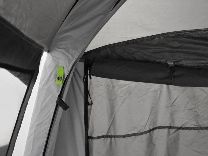 La tente est complètement indépendante, ce qui permet d’utiliser la voiture ou le fourgon pour faire des courses sans avoir à démonter la tente. La porte avant et la porte latérale de la tente peuvent être utilisées comme solette, les mâts de solette nécessaires sont fournis. De plus, la tente est équipée d’un tapis de sol fixe cuvette, ce qui vous permet d’empêcher l’eau et les insectes d’entrer.