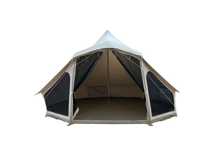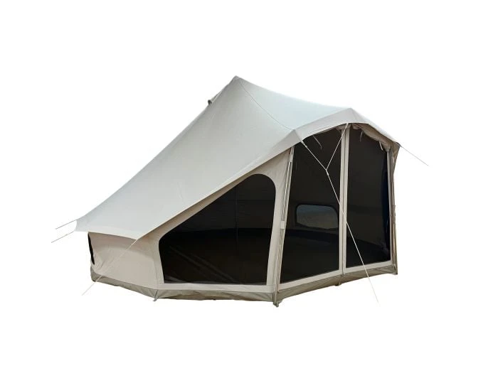 La tente tipi Sahara 500 High Door Bell est dotée d’un tapis de sol entièrement cousu en PVC solide et de haute qualité. Ce tapis de sol est particulièrement résistant et totalement étanche. De plus, la tente dispose de plusieurs ouvertures d’aération fermables dans les parois latérales et d’une ventilation permanente dans le faîte.