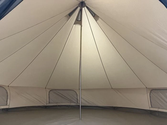 La tente tipi Obelink Sahara 500 High Door Bell offre de la place pour deux à trois personnes, avec beaucoup d’espace de vie restant. Un grand matelas pneumatique double se glisse facilement derrière le poteau central. Avec des matelas pneumatiques ou des matelas plus petits, il y a de la place pour un maximum de 8 personnes.