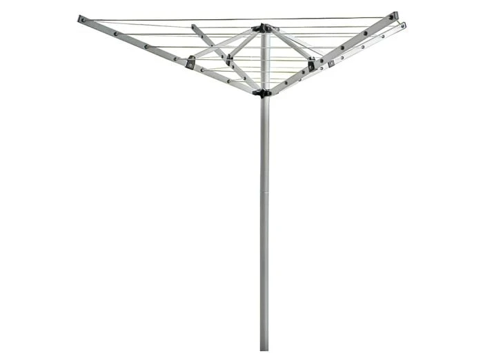 Le séchoir 4 bras en aluminium d’Obelink peut être placé dans un support supplémentaire fixé à la roue jockey. Équipé d’une corde à linge de 16 mètres et d’un mât en aluminium de 38 mm de diamètre.