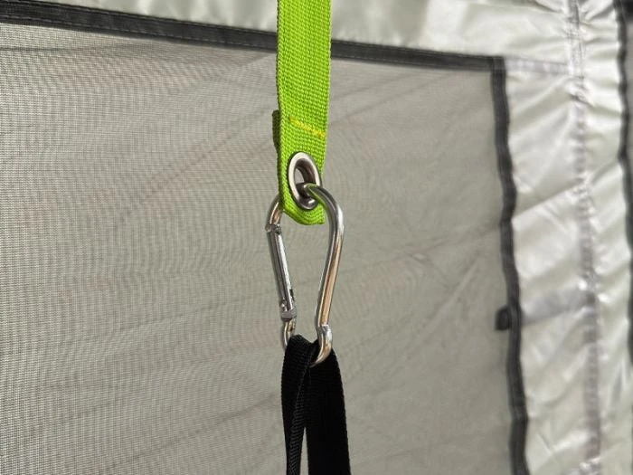 La tringle est muni de sangles réglables des deux côtés avec un mousqueton, de sorte que vous pouvez facilement l’attacher à un anneau, une boucle ou une armature de tente. Les sangles sont réglables en hauteur de 10 à 34 centimètres. Cela vous permet également d’accrocher la tringle directement sous le toit d’une tente en pente.