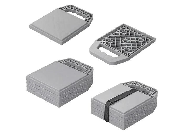 Empilables et robustes, ces plaques évitent que les appuis ne s’enfoncent dans un sol meuble, comme du sable ou de la terre. Vous améliorez ainsi la stabilité de votre véhicule de loisirs, même sur des terrains irréguliers.