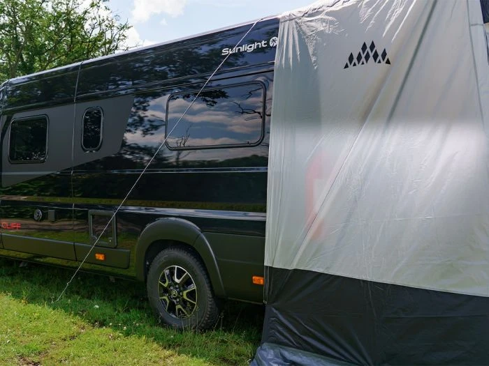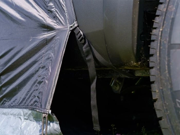 Le tapis de sol fourni a un bord surélevé équipé d’une fermeture Velcro tout autour pour une connexion étanche avec la tente. Une bande Velcro autocollante est également incluse que vous pouvez coller une seule fois sur le pare-chocs du camping-car. Vous pouvez également fixer le tapis de sol au pare-chocs pour sceller le dessous du camping-car.